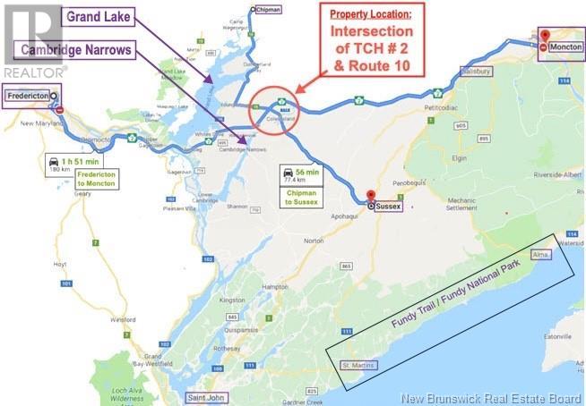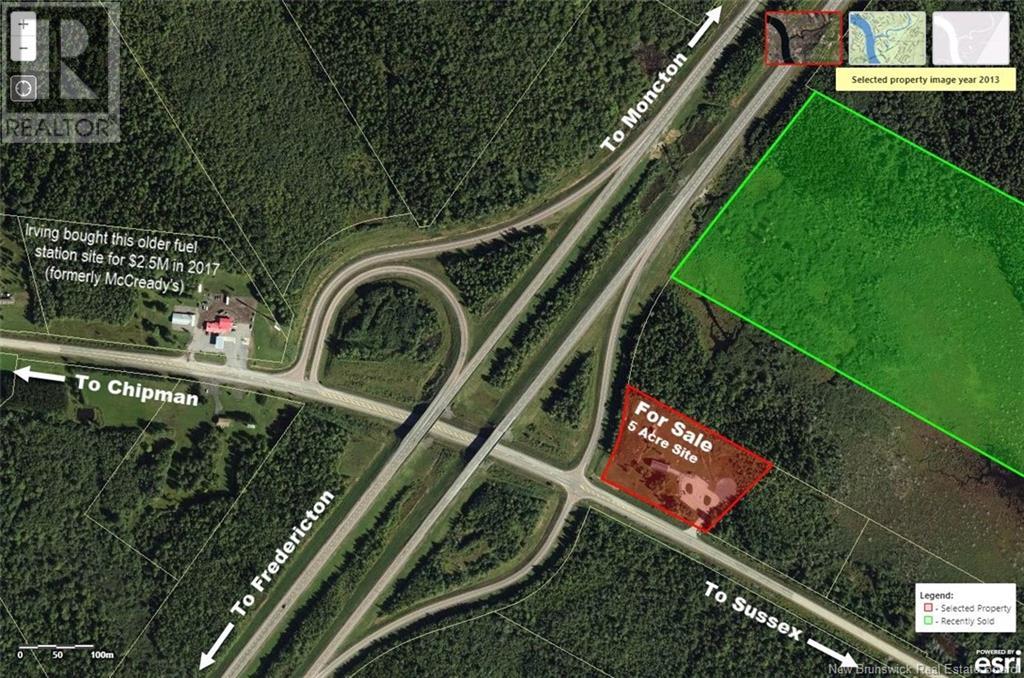 Welcome to the former Covered Bridge Visitor Info Center! This unique 5 acre site is fully developed and could be the ideal location for your next big residential or commercial venture! Strategically located at the crossroad of Trans-Canada Hwy#2 and Route 10, which services both local residents and visitors travelling to neighboring provinces and to popular NB sites such as Grand Lake, Cambridge Narrows, Coles Island, Fundy National Park, Sussex, and beyond. Located halfway between Moncton & Fredericton, with average daily traffic counts (AADT) estimated at 17,000 vehicles, peaking at 30,000+ vehicles during summer months due to increased vacation travel. The main building has ~2,000 square feet of space and previously operated as a provincial Visitor Information Center. It was designed to look like an iconic NB Covered Bridge in a beautiful park like setting. Featuring commercial grade construction, high ceilings with attractive cedar beams, hemlock flooring, and large windows offering natural lighting and scenic nature views. The building has been renovated with 3 new washrooms and a new kitchen space. The site has a large paved driveway and parking lot, drilled well, underground electrical services, and a commercial grade septic system with lift station designed to accommodate 80 washroom visitors per half hour. Available documents include: site plan, building floor plans, septic system diagram, and original engineering drawings. (id:19018)
