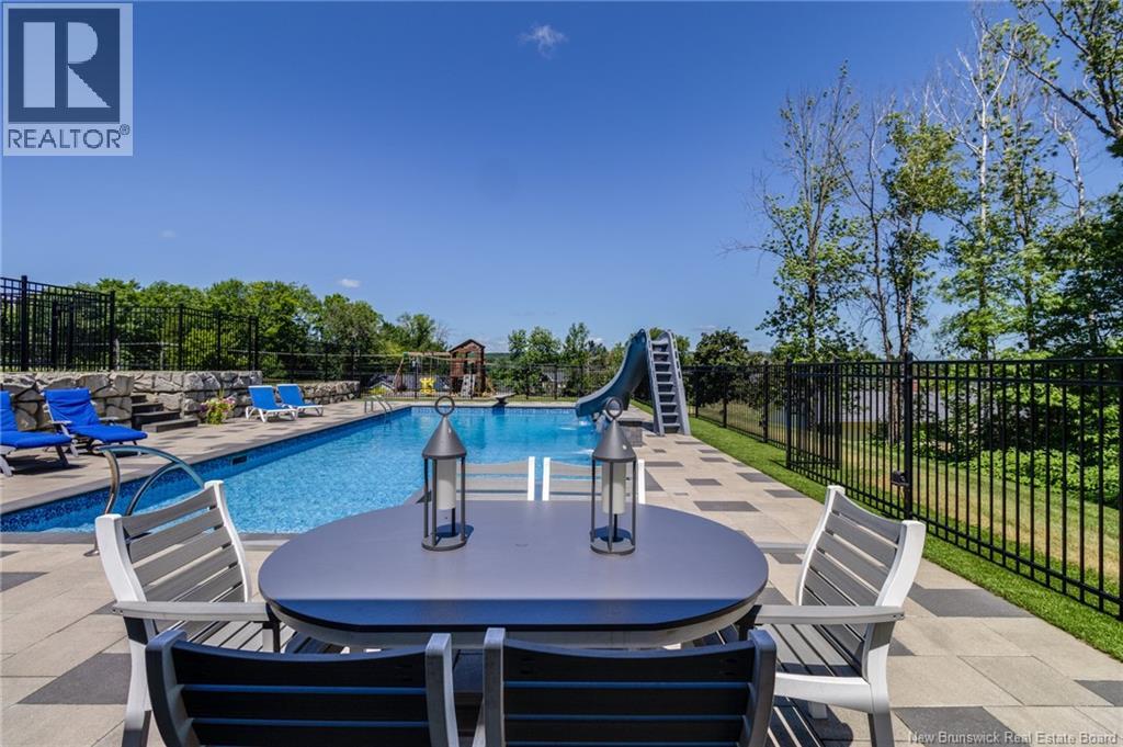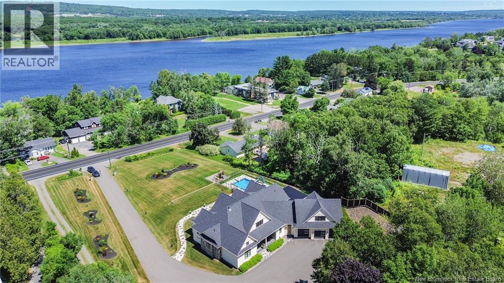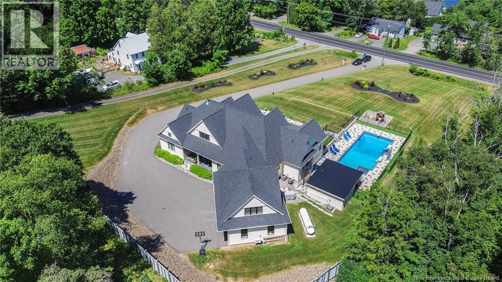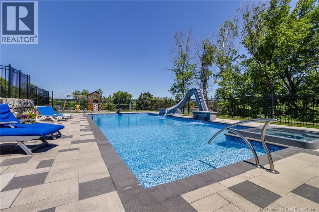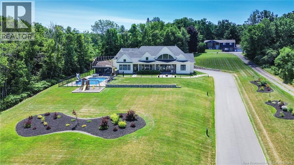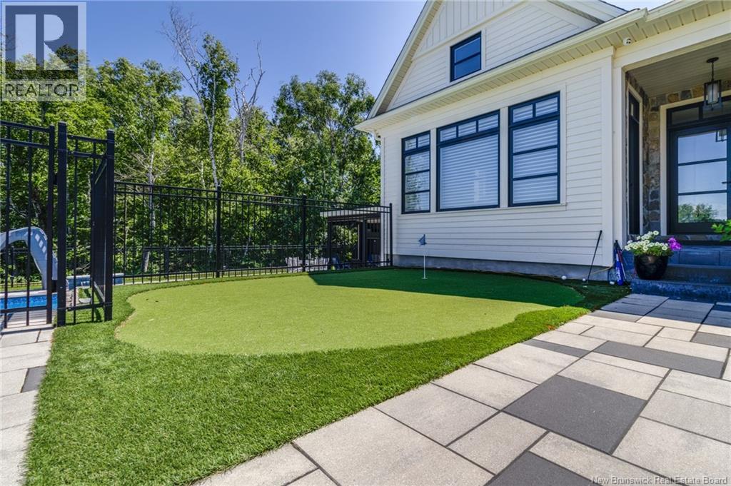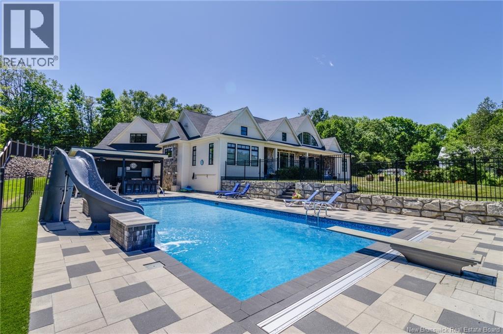 An exquisitely crafted, custom-built home situated on 1.5 acres in Fredericton South. No detail has been spared in the conception and construction of this remarkable estate-style property with over 5,300 sqft of finished space. The open-concept main living area features a spacious living room adorned with bespoke built-in cabinetry,23 foot ceilings, gas fireplace, and patio doors that lead to an outdoor sitting area offering serene river and overland views. The gourmet kitchen showcases a generous island, a eight-burner gas stove, dual dishwashers and a butlers pantry. The primary suite is a sanctuary of luxury featuring cathedral ceilings, a sprawling 15x18 walk-in closet and a spa-inspired bathroom featuring dual vanities, a custom-tiled shower and heated floors. At the opposite end of the home are two additional well-appointed bedrooms each with its own ensuite bath. A versatile fourth bedroom, currently utilized as a media room, and a large office complete this level. Staircase accessed from the mudroom, leads to the gym area and ½ bath located above the oversized 3 car garage. The lower level is partially finished including a 4th full bath, a spacious family room, and a children's secret room featuring a ball pit and climbing ladder. The outdoor amenities are equally impressive, with an exquisite in-ground pool, an expansive pool house complete with a bar and bathroom, and even an artificial turf putting green the perfect complement to this stunning estate. (id:19018)
