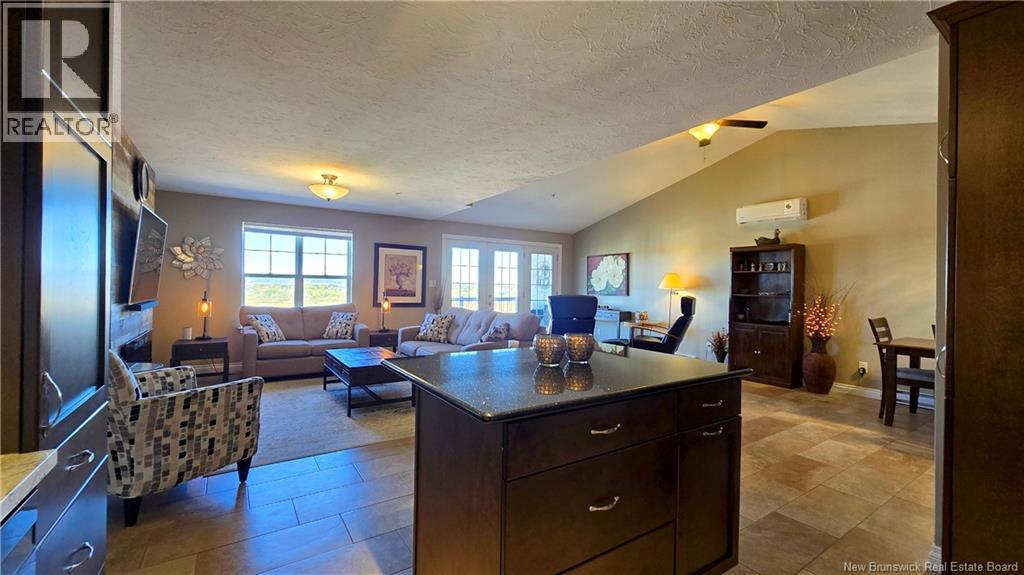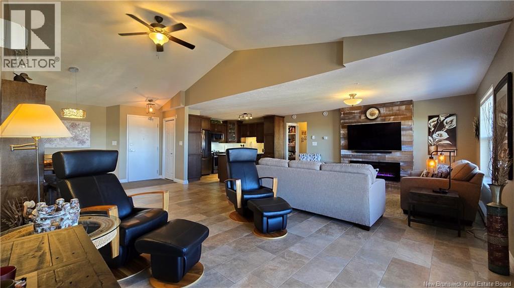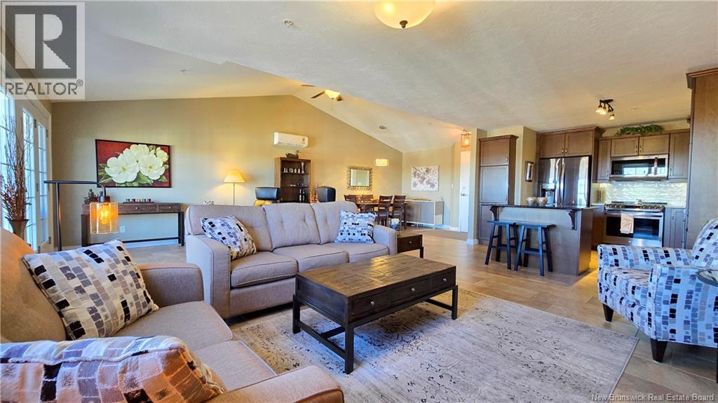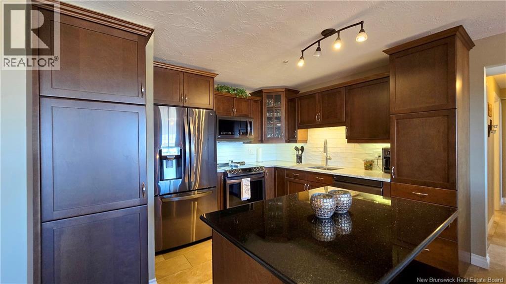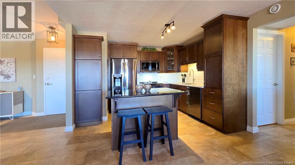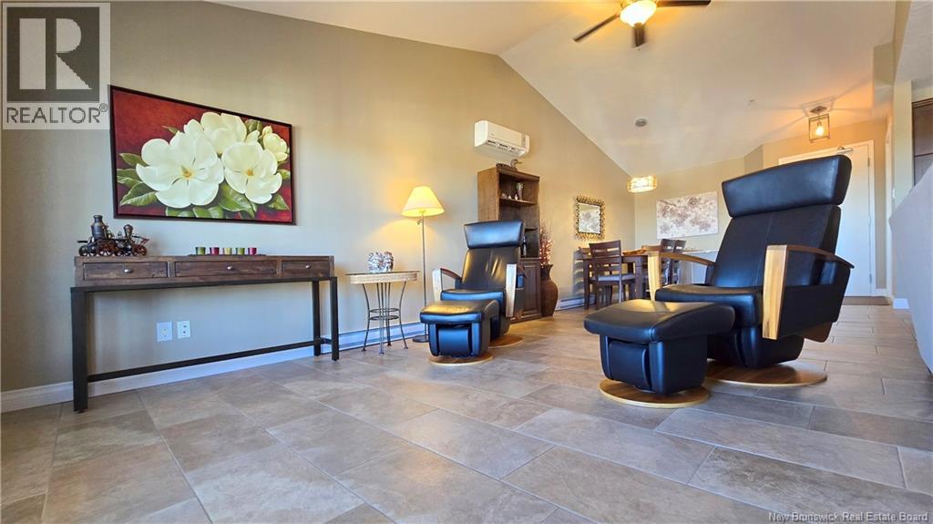 Experience the perfect blend of comfort, convenience, and style in this centrally located executive condo! From the moment you step inside, youre greeted by vaulted ceilings and an open, airy layout that makes this space truly special. The kitchen is both beautiful and functional, featuring stainless steel appliances (only 5 years old), a mix of granite and quartz countertops, a center island & lots of storage. The open concept living and dining area is filled with natural light & flows seamlessly to your private balcony, where you can start your morning with a cup of coffee while taking in the river and city views. The primary bedroom is a relaxing retreat with large windows overlooking the river, a spacious walk-in closet, and a generous ensuite complete with double sinks and a large walk-in shower. The 2nd bedroom also features river views and two closets. A 2nd full bathroom with a tub adds both comfort and convenience to the space. Additional features include a dedicated underground parking space, fitness center, social room & elevator access. Outside your door, simply walk down the hill to enjoy the waterfront walking trail, walk up the hill to the golf course, or take less than a 5 minute to drive to downtown Moncton. Whether you're experiencing the beautiful sun sets over the river, watching the tidal bore, enjoying peaceful morning strolls along the water, or practicing your swing at the golf course, this condo offers a lifestyle thats hard to match! (id:19018)