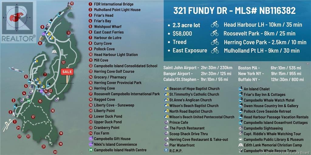 321 Fundy Drive (Lot 86-118), 2.3 Acre, mixed treed building lot along Fundy Drives west side. Lot is exempt from Canadas Foreign Buyers Ban (link below). Save or remove trees for possible east facing ocean view. Campobello is Island Life, surrounded by salt water of Bay of Fundy with many coves to bike, hike, jog & explore breathtaking views. The serenity will make each day a pleasure to be part of the community. International bridge that connects to mainland US is minutes away which give access to both international airports and port-of-call in Maine and New Brunswick. ISLAND POI: Head Harbour & Mullholland Point Lighthouses, Roosevelt Campobello Park, world class golfing, whale watching, churches, boating & seafood, to go along with local basics of groceries, pharmacy, shops & restaurants. You will be happy to vacation or retire here! (id:19018)