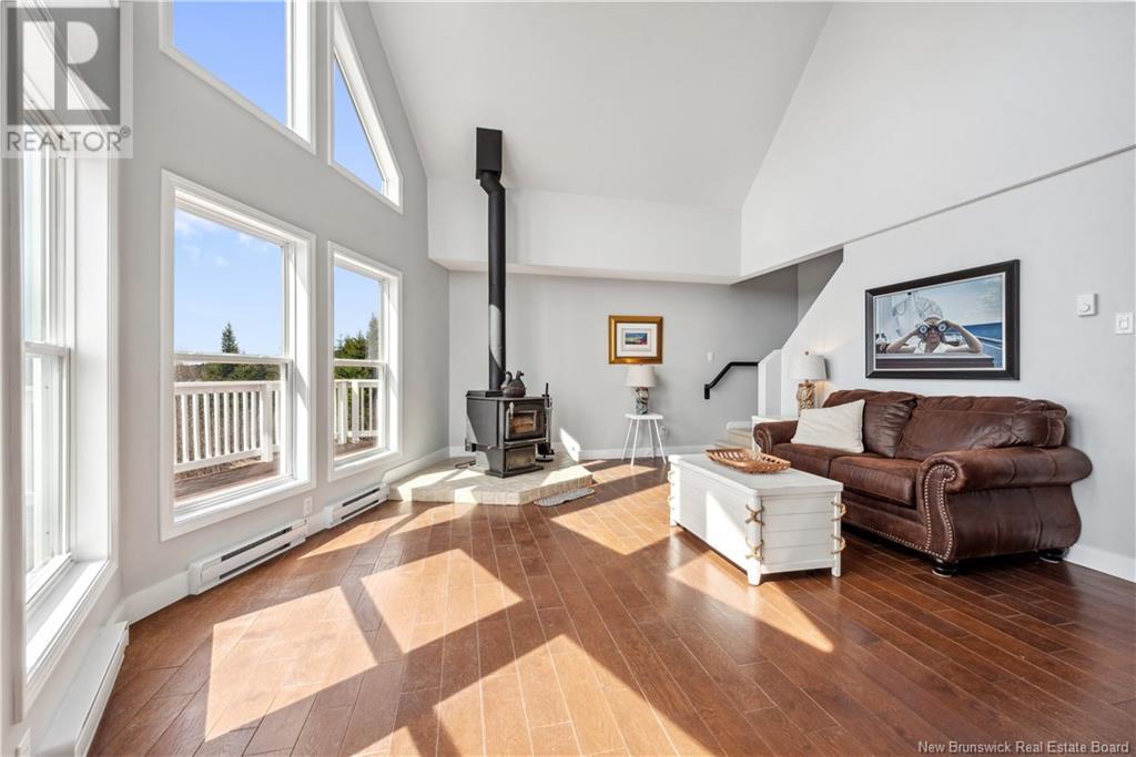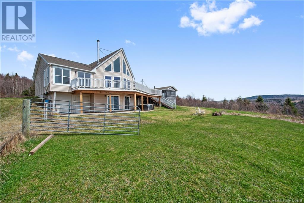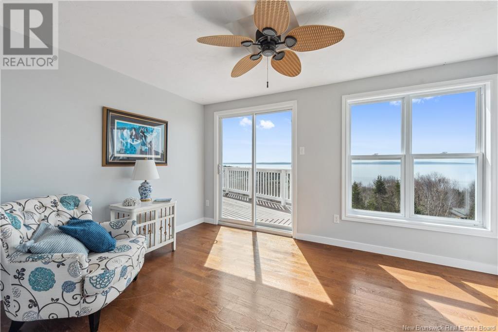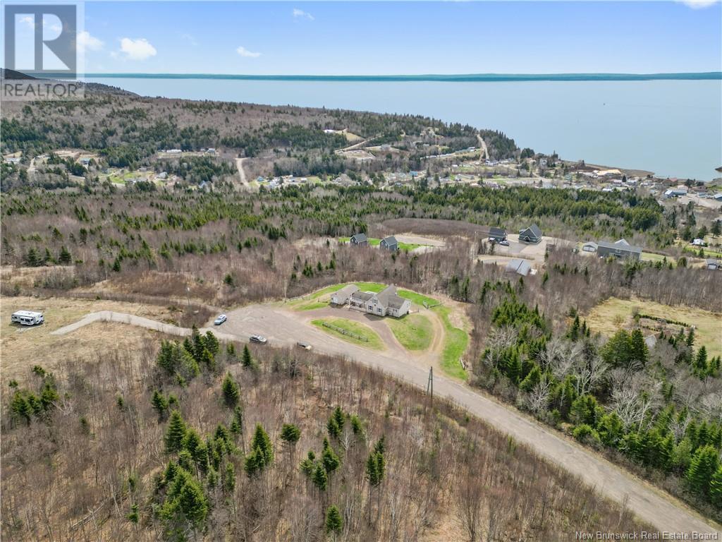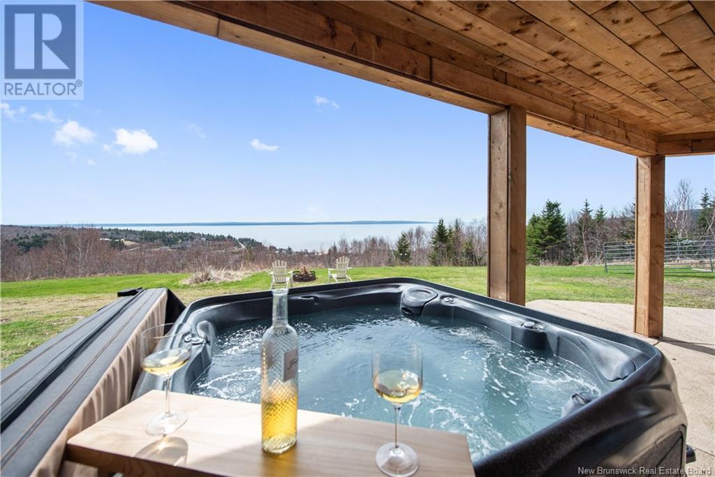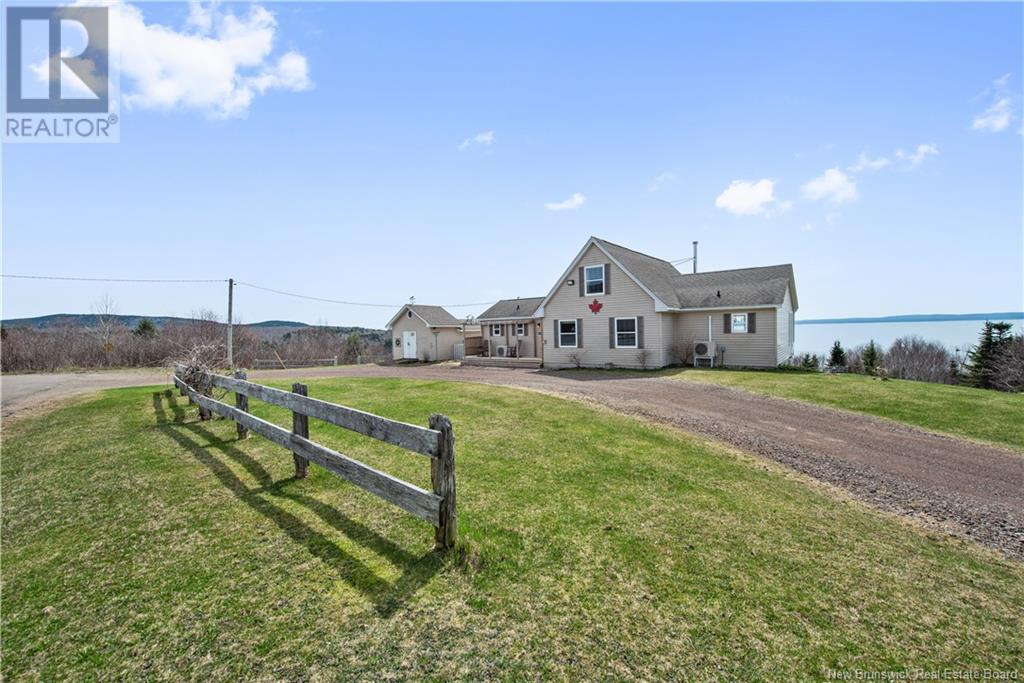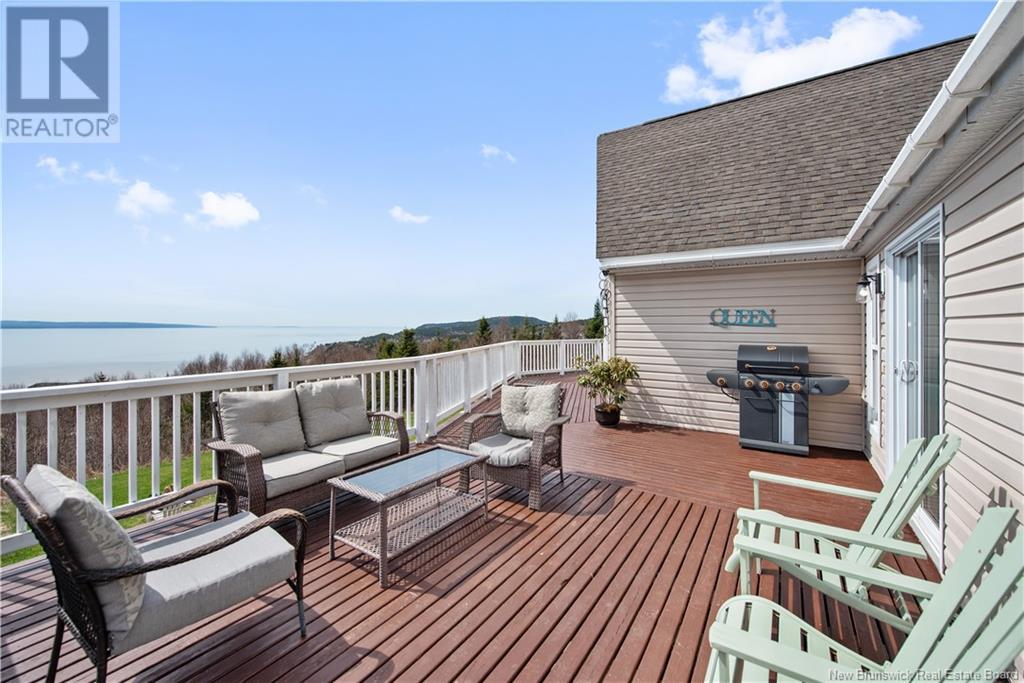 Charming hilltop home with panoramic view of the Bay of Fundy and Alma hillside. Main floor features living room with cathedral ceiling, woodstove, and a wall of windows overlooking the bay, updated kitchen with Quartz counter tops and gas stove, main floor laundry/pantry area, spacious primary bedroom with cheerful sitting room with water view and access to back deck, 4 piece ensuite bathroom, bedroom, and a half bath. Upper level has a private 3rd bedroom. Walkout basement gets tons of natural light and offers a 4th bedroom, also with a great view, and has a patio door to backyard, 3 piece bath, and 2 large storage rooms which could be finished if more living space is desired. Home has two mini splits for efficient heating and cooling and also has a generator panel. Hot tub new in 2024. Property is 1.9 acres and is fenced in the back. Handy ATV and snowmobile trails. Storage shed and charming gazebo overlooking the water. Quaint fishing village of Alma is a popular spot in the summer and is handy beaches, shops, restaurants, Fundy National Park, Marys Point, and World Famous Hopewell Rocks. An ideal spot for an Air BnB! (id:19018)